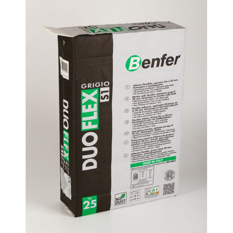 Adesivo in polvere per piastrelle tixotropico altamente deformabile per uso interno ed esterno composta da cemento, inerti a granulometria scelta, resine sintetiche ed additivi speciali. Serve a posare in modo rapido e sicuro gres porcellanato, lastre ceramiche a basso spessore, monocottura non assorbente, bicottura, pietre naturali e ricomposte stabili all'umidità anche su sottofondi non assorbenti o soggetti a lievi variazioni dimensionali. L'elevata resistenza allo scivolamento verticale consente la posa dei rivestimenti dall'alto. Utilizzabile anche come adesivo autobagnante, estremamente facile da usare, alta resa. Conf. da 25 kg. Classe C2TE S1