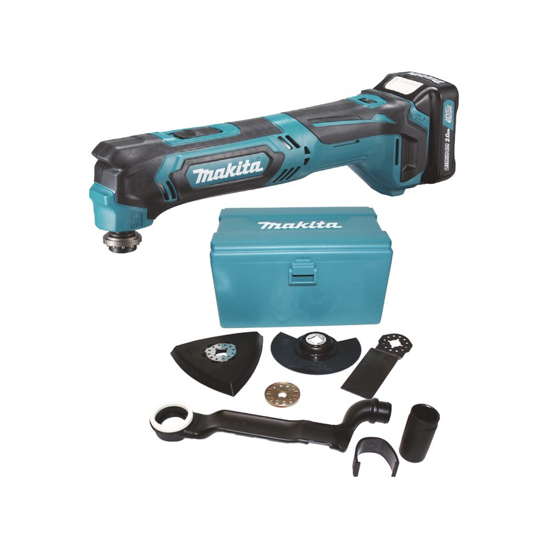 Utensile multifunzione 10,8V fornito con set accessori (lame e platorello) e raccordo per aspirazione, luce a led incorporata, tempo di carica 30 minuti, peso 1,1 kg, comprensivo di 2 batterie a 2,0 Ah e caricabatteria.