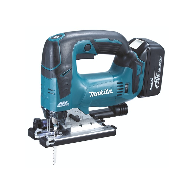 Seghetto alternativo professionale con motore BL ad alta potenza, dotato di ingresso per tubo di aspirazione, luci a led, velocità massima 3500 giri/minuto, capacità di taglio 135 mm, peso 2,4 kg, tempo di carica 45 minuti. Completo di 2 batterie 18V 5 Ah e caricabatteria.