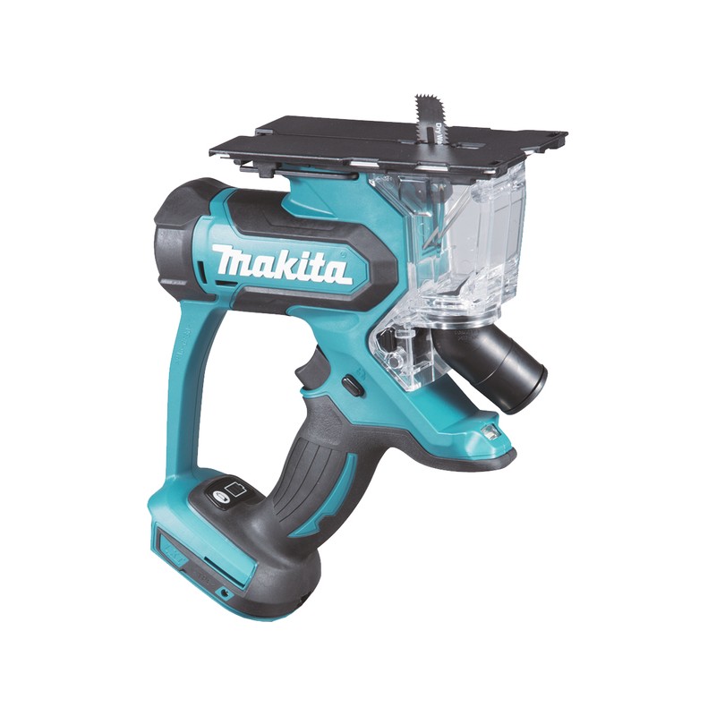 Seghetto per cartongesso e legno 18V ad elevate prestazioni, con capacità di taglio anche a soffitto di 30 mm per cartongesso e 15 mm per legno, luci a led incorporate, utensile estremamente leggero solo 1,9 kg. Dotato di ingresso per tubo di aspirazione. Batterie e caricabatterie non inclusi.