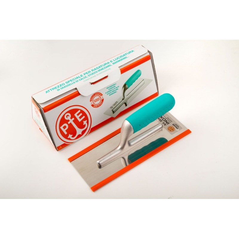 Frattone in acciaio inox professionale con manico ergonomico in gomma, specifico per lucidatura marmorino. Dimensioni 240 x 100 mm.