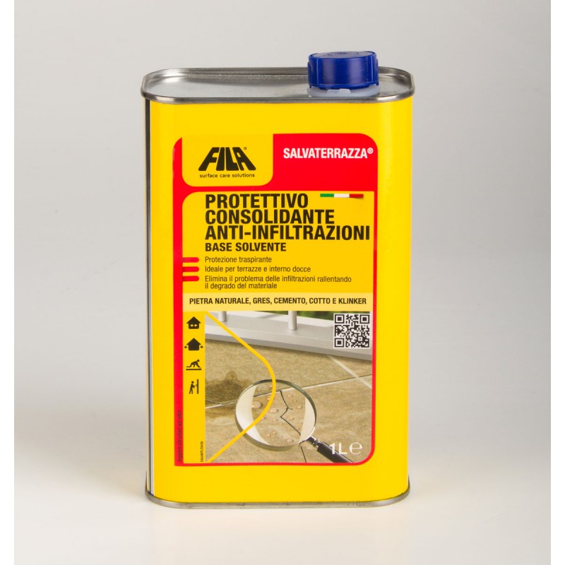 Protettivo pronto all'uso a resa elevata che ripara e protegge le terrazze in cotto, klinker, gres e cemento, pietre naturali dall'acqua e dall'umidità. Previene la percolazione dell'acqua, la formazione di muffe ed efflorescenze. Protegge le fughe, lascia traspirare e non ingiallisce. Resa di 1 litro di prodotto: cotto-pietra 10/15 m² gres porcellanato-klinker 30 m². Lattina da 1 litro.